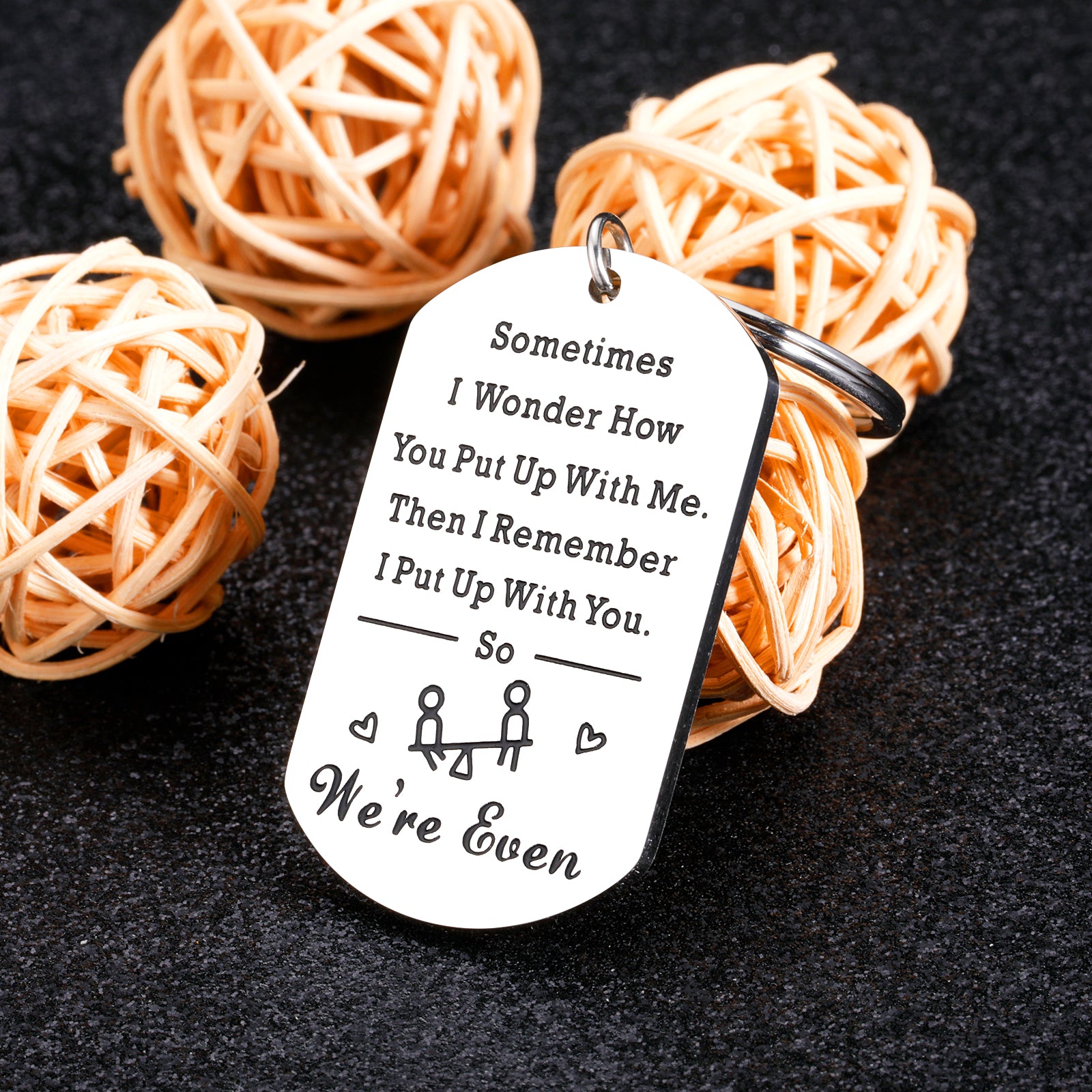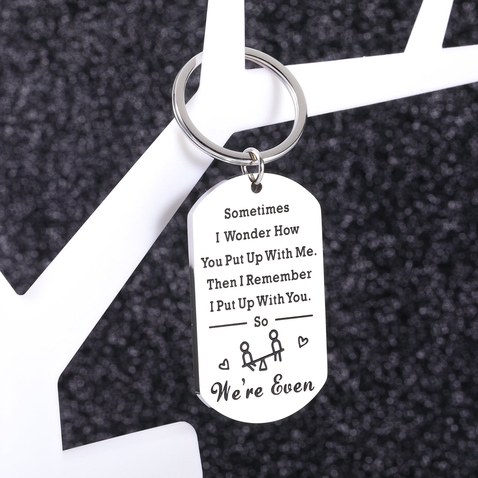 👩❤️💋👨【Gifts for Wife Husband】This funny keychain is engraved with humor words: Sometimes I wonder how you put up with me, then I remember I put up with you, so we’re even. Interesting Gifts for boyfriend,15 year anniversary gift, valentines keychains for boyfriend, girlfriend gifts for Christmas, couple gifts for Christmas, lesbian stuff gifts, stocking stuffers for husband boyfriend, meaningful gifts for boyfriend, Christmas presents, Christmas presents for boyfriend, fiance gifts for him