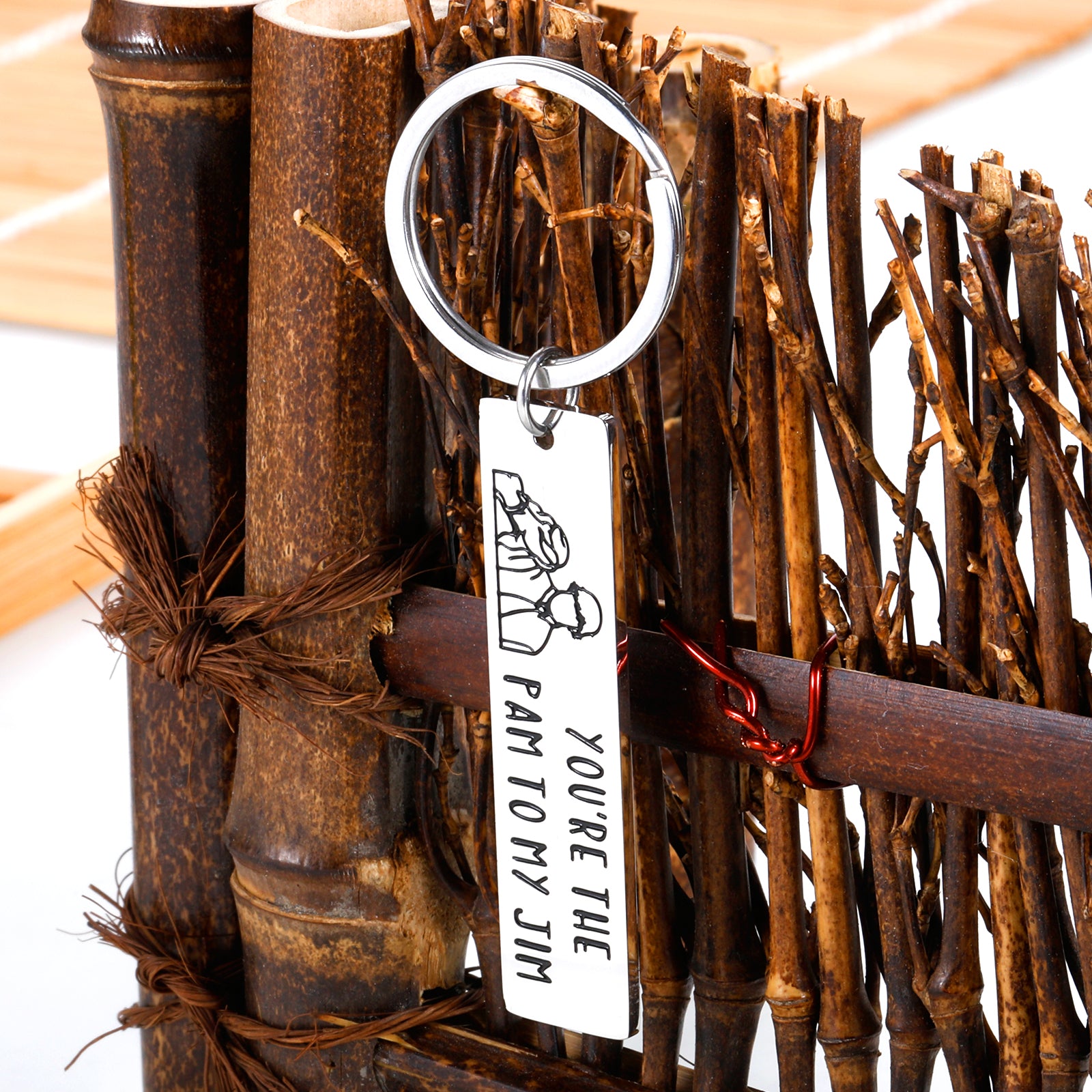 - The Office TV Show for Her Him - You Are The Pam to My Jim Keychain is made of thick and sturdy materical. Nice weight in hand. Engraving is deep and clear, with black inking that stays strong.